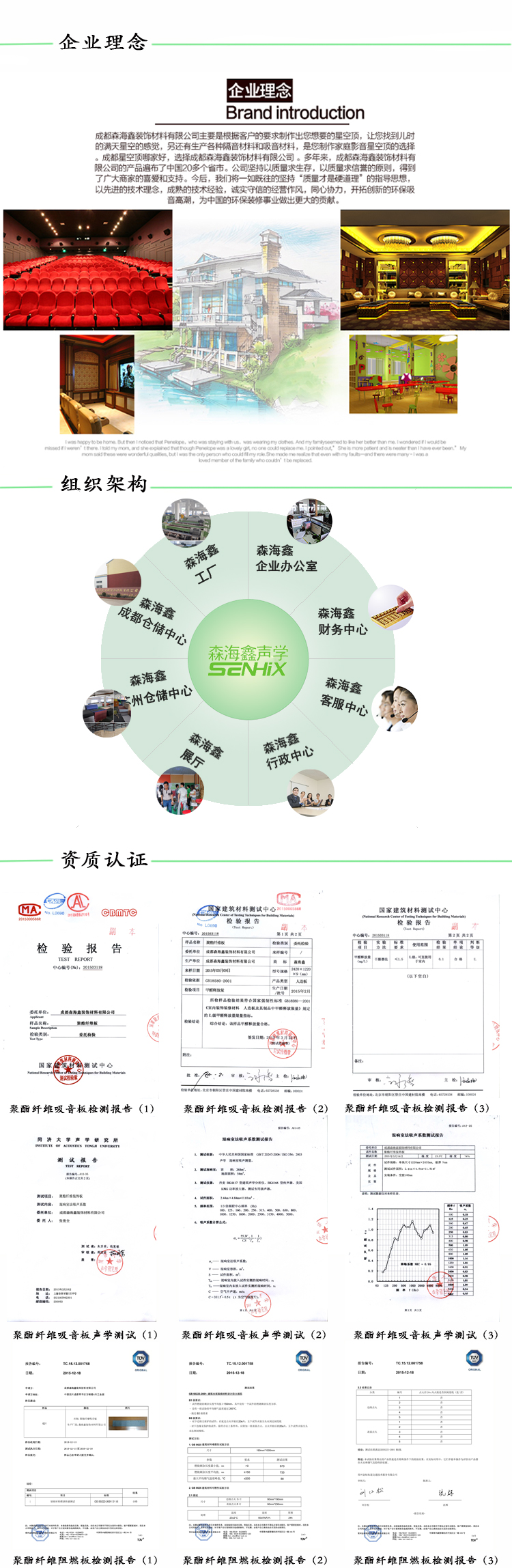 森海鑫倡导绿色消费理念,以高品质、高环保产品为载体,致力于打造中国最具影响的声学装饰材料综合服务商。公司从单一的产品生产企业发展为多元化的声学装饰材料综合服务商。