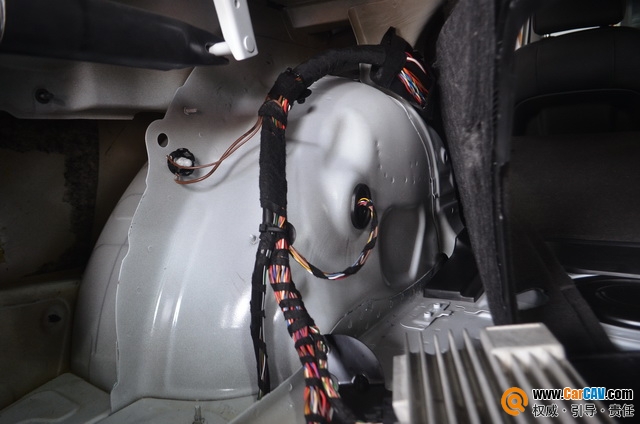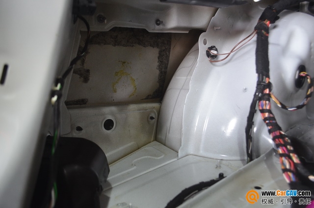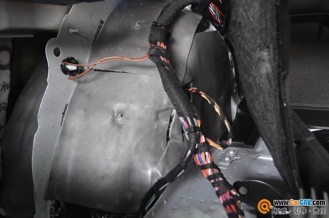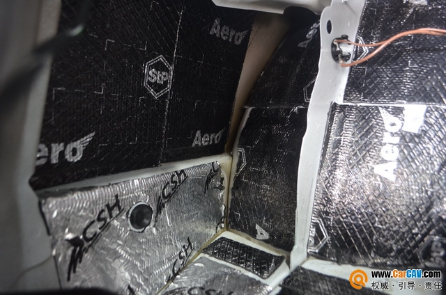 针对后尾箱备胎仓,这里类似于一个巨大的空腔,噪音极易在此汇集,同时后轮毂及后翼子板处,收到风噪及胎噪的干扰,噪音污染十分严重。针对这情况使用STP航空炸弹隔音材料进行条贴处理,分割备胎仓,后轮毂处满铺STP隔音材料,吸收此处震动,抑制共振噪音和外界噪音从轮毂位置传入。